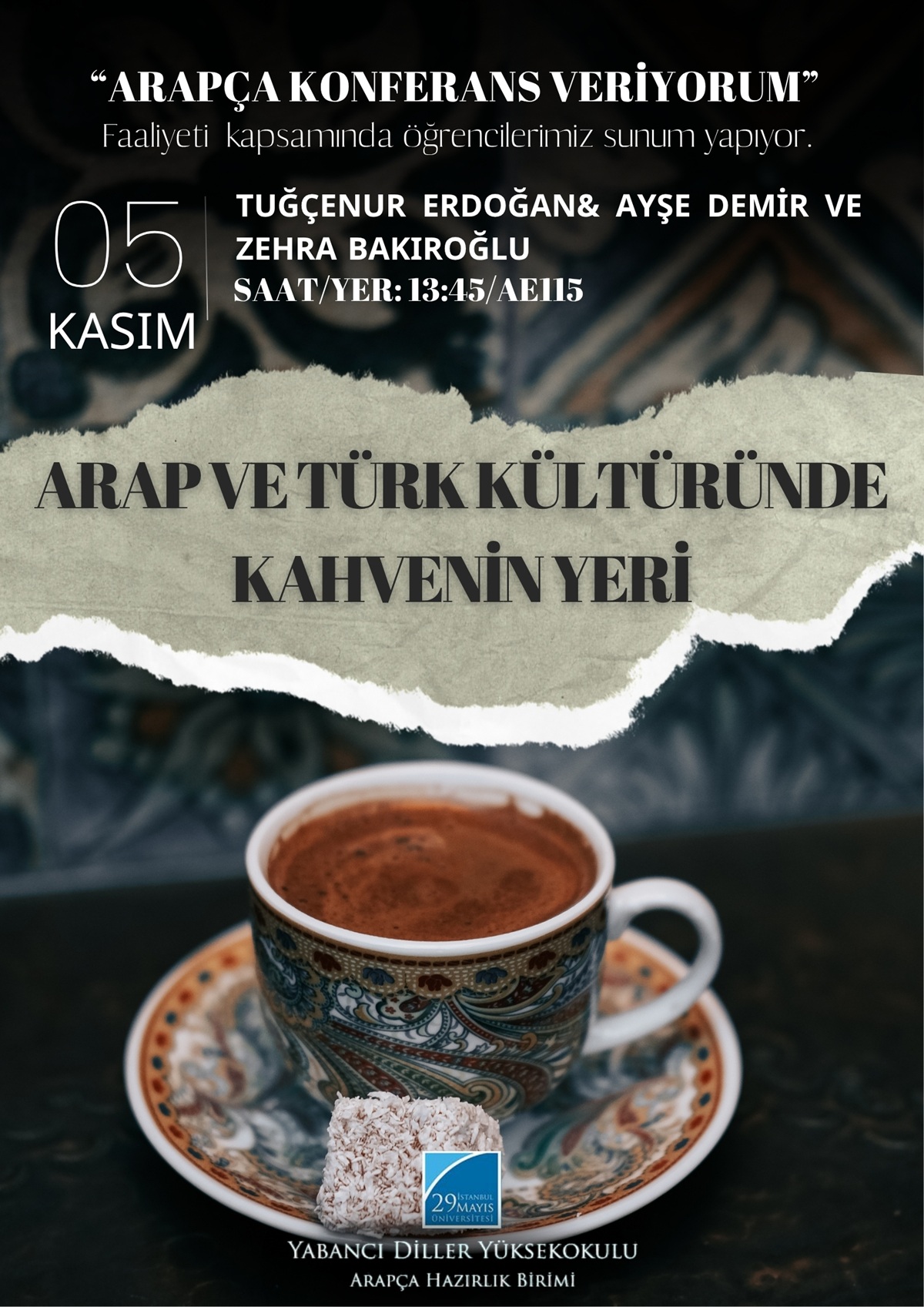 Arapça Hazırlık Birimi öğrencilerimiz, her hafta düzenlenen "Arapça konferans veriyorum" faaliyeti kapsamında tüm hazırlık öğrencilerinin önünde sunum yapmaktadır. Bu haftaki sunumda öğrencilerimizden Tuğçenur Erdoğan, Ayşe Demir ve Zehra Bakıroğlu, “Arap ve Türk Kültüründe Kahvenin yeri” konusunu ele alacaklardır.