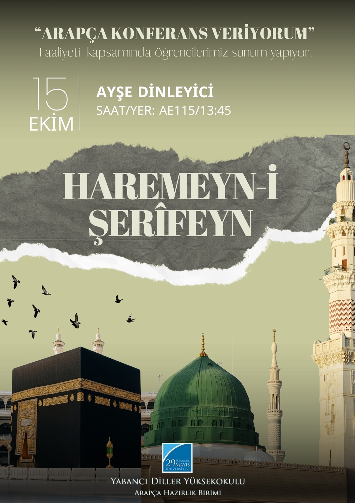 Arapça Hazırlık Birimi öğrencilerimiz, her hafta düzenlenen "Arapça konferans veriyorum" faaliyeti kapsamında tüm hazırlık öğrencilerinin önünde sunum yapmaktadır. Bu haftaki sunumda öğrencimiz Ayşe Dinleyici, “Haremeyn-i Şerifeyn” konusunu ele alacaktır.