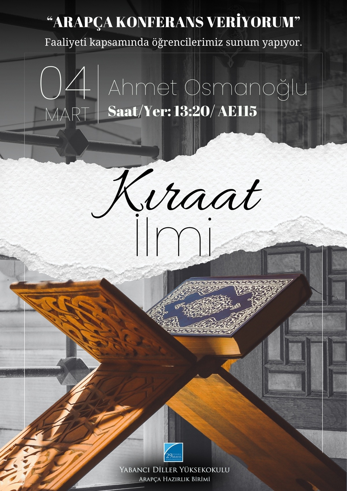 Arapça Hazırlık Birimi öğrencilerimiz, her hafta düzenlenen "Arapça konferans veriyorum" faaliyeti kapsamında tüm hazırlık öğrencilerinin önünde sunum yapmaktadır. Bu haftaki sunumda öğrencilerimizden Ahmet Osmanoğlu “Kıraat İlmi" başlıklı konuyu ele alacaktır.