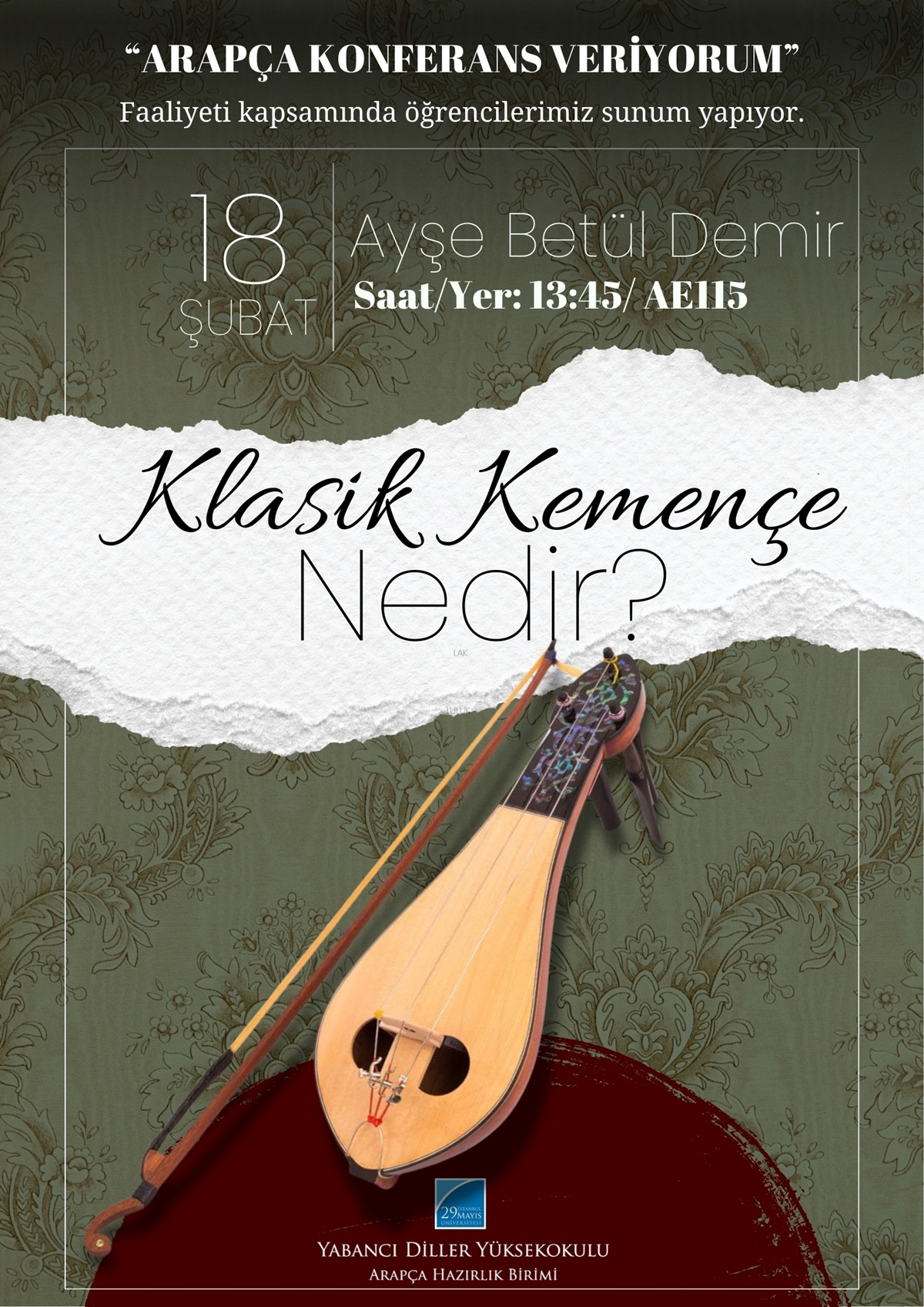 Arapça Hazırlık Birimi öğrencilerimiz, her hafta düzenlenen "Arapça konferans veriyorum" faaliyeti kapsamında tüm hazırlık öğrencilerinin önünde sunum yapmaktadır. Bu haftaki sunumda öğrencilerimizden Ayşe Betül Demir “Klasik Kemençe Nedir" başlıklı konuyu ele alacaktır.