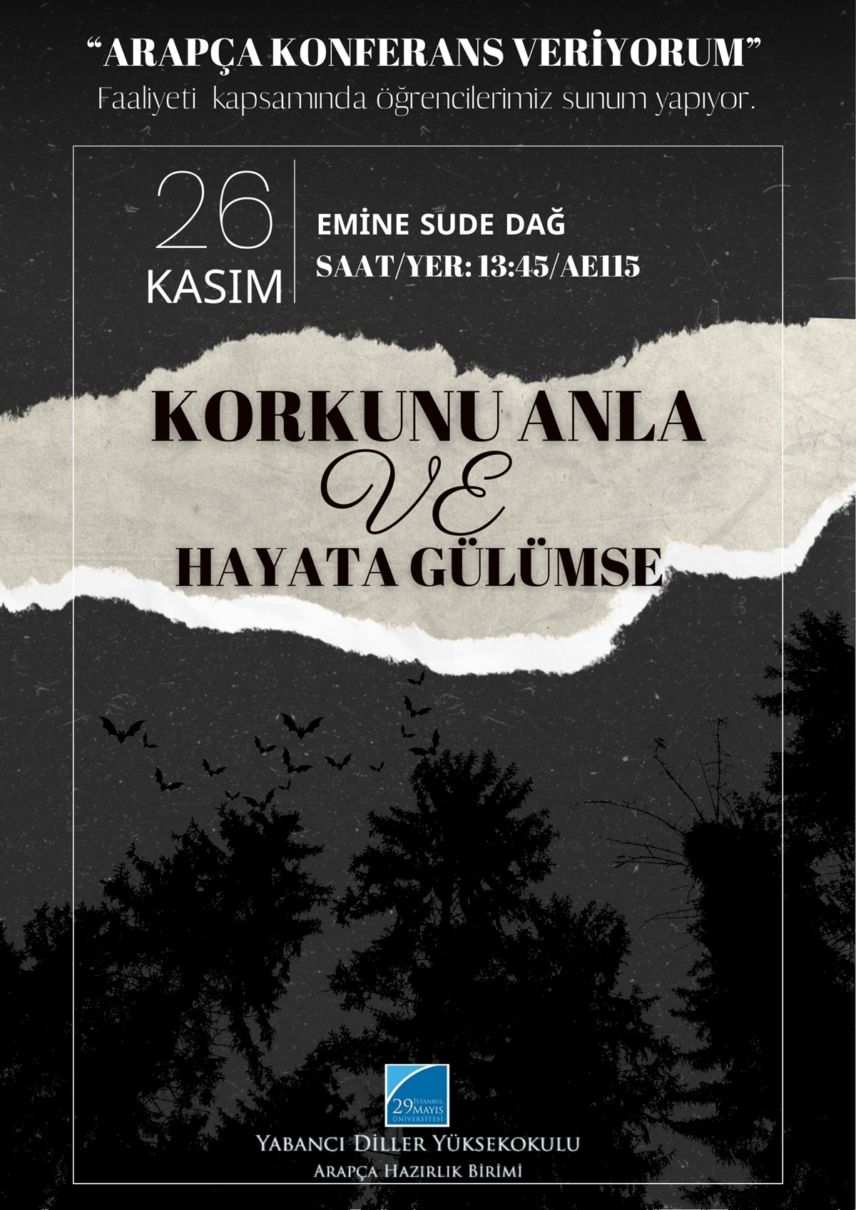 Arapça Hazırlık Birimi öğrencilerimiz, her hafta düzenlenen "Arapça konferans veriyorum" faaliyeti kapsamında tüm hazırlık öğrencilerinin önünde sunum yapmaktadır. Bu haftaki sunumda öğrencilerimizden Emine Sude Dağ “Korkunu Anla ve Hayata Gülümse" başlıklı konuyu ele alacaktır.
