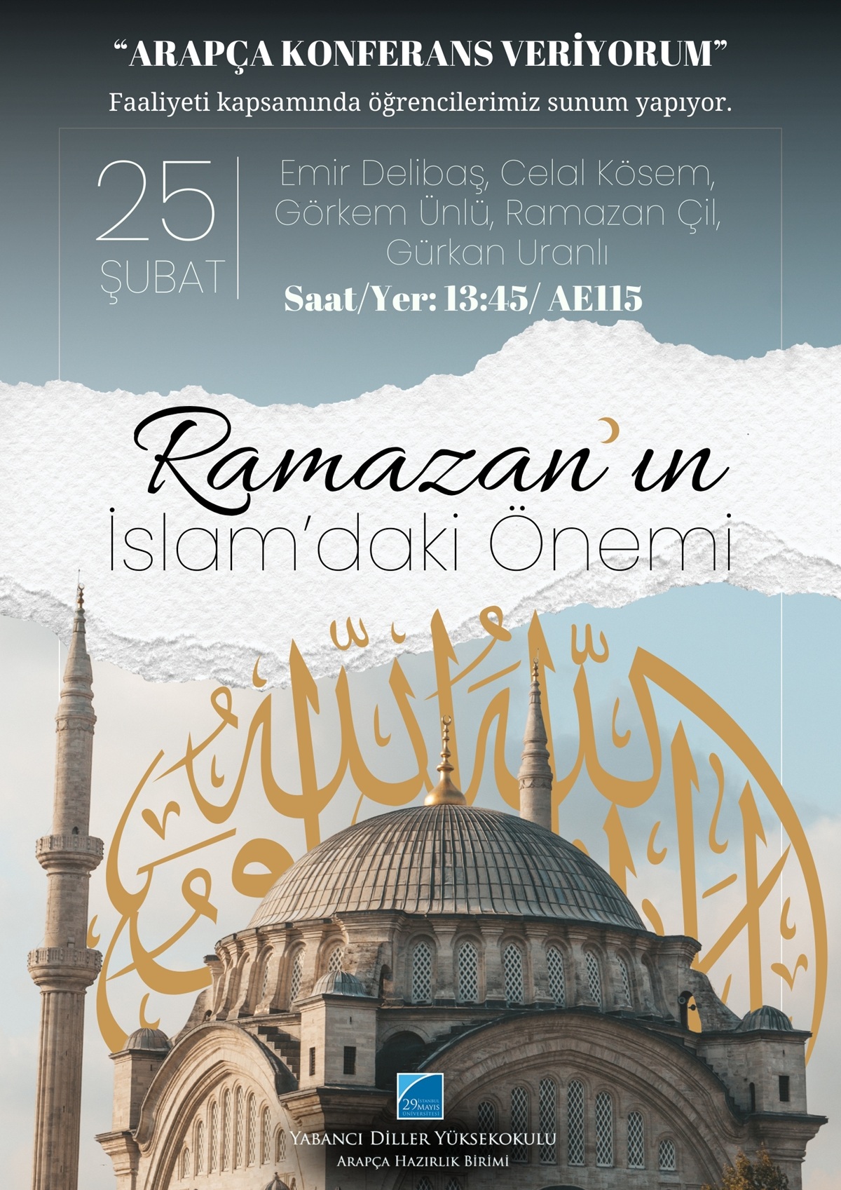 Arapça Hazırlık Birimi öğrencilerimiz, her hafta düzenlenen "Arapça konferans veriyorum" faaliyeti kapsamında tüm hazırlık öğrencilerinin önünde sunum yapmaktadır. Bu haftaki sunumda öğrencilerimizden Emir Delibaş,