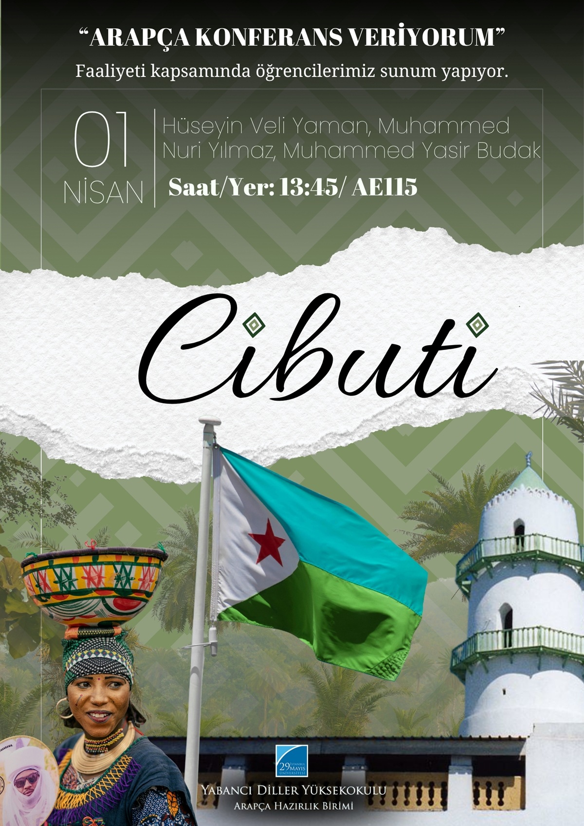 Arapça Hazırlık Birimi öğrencilerimiz, her hafta düzenlenen "Arapça konferans veriyorum" faaliyeti kapsamında tüm hazırlık öğrencilerinin önünde sunum yapmaktadır. Bu haftaki sunumda öğrencilerimizden Hüseyin Veli Yaman, Muhammed Nuri Yılmaz ve Muhammed Yasir Budak “Cibuti" başlıklı konuyu ele alacaktır.Her hafta gerçekleştirilen bu sunumlar, öğrencilerimizin Arapçayı yabancı bir dil olarak kullan