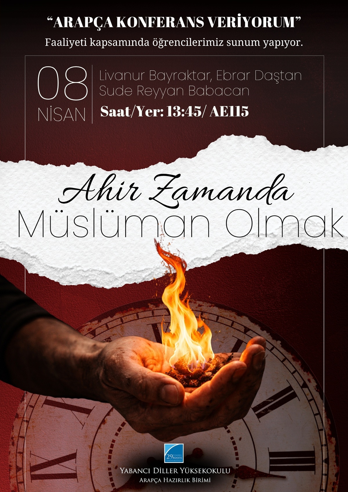 Arapça Hazırlık Birimi öğrencilerimiz, her hafta düzenlenen "Arapça konferans veriyorum" faaliyeti kapsamında tüm hazırlık öğrencilerinin önünde sunum yapmaktadır. Bu haftaki sunumda öğrencilerimizden Livanur Bayraktar, Ebrar Daştan ve Sude Reyyan Babacan “Ahir Zamanda Müslüman Olmak" başlıklı konuyu ele alacaktır.Her hafta gerçekleştirilen bu sunumlar, öğrencilerimizin Arapçayı yabancı bir dil ol