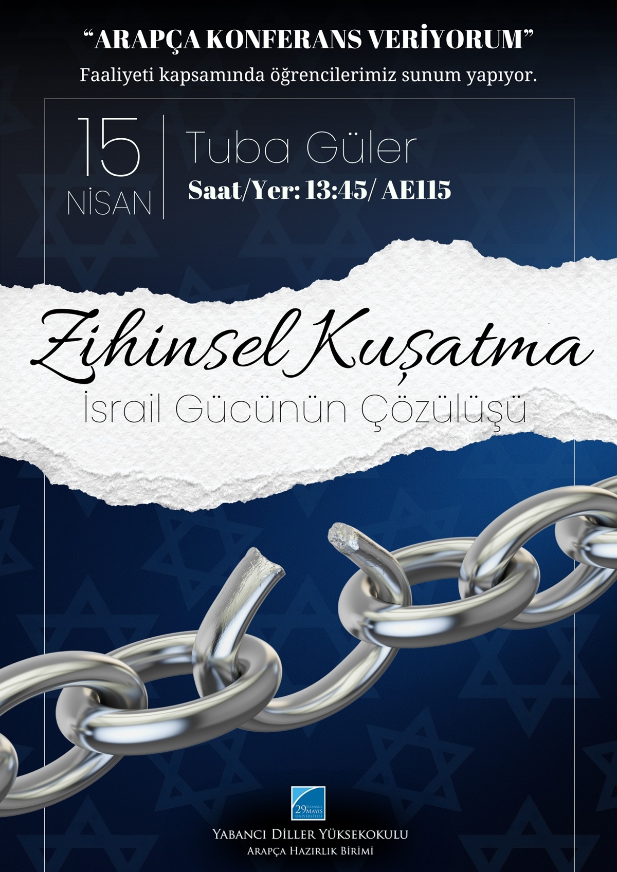 Arapça Hazırlık Birimi öğrencilerimiz, her hafta düzenlenen "Arapça konferans veriyorum" faaliyeti kapsamında tüm hazırlık öğrencilerinin önünde sunum yapmaktadır. Bu haftaki sunumda öğrencilerimizden Tuba Güler “Zihinsel Kuşatma: İsrail Gücünün Çözülüşü" başlıklı konuyu ele alacaktır.Her hafta gerçekleştirilen bu sunumlar, öğrencilerimizin Arapçayı yabancı bir dil olarak kullanırken kendilerine o